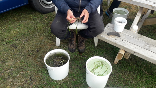 - i et sundt ålegræsbed løfter man en klump af planter ud med en rive